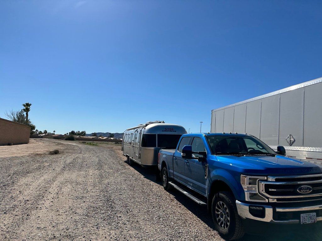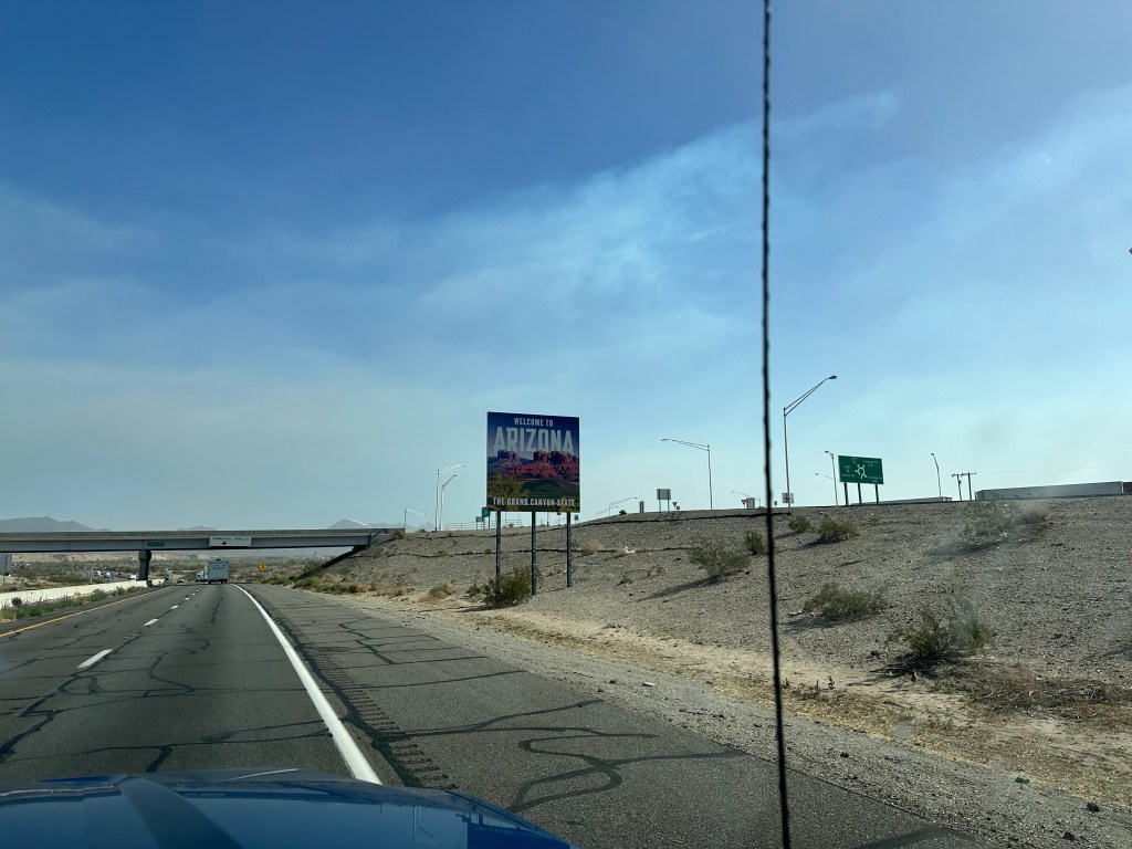 The above photo is from the Tejon Pass rest area just west of the California/Arizona border, where we worked Monday morning. We woke up that morning in Menifee, California and drove a few hours, then chose this beautiful spot to stop for the morning’s work. After about two and a half hours, the wind started blowing, gently at first then more furiously. Micki checked the weather and learned that a high wind warning was in effect for the Tejon Pass area covering the next six hours or so. We hopped in the truck and headed for Arizona quickly.