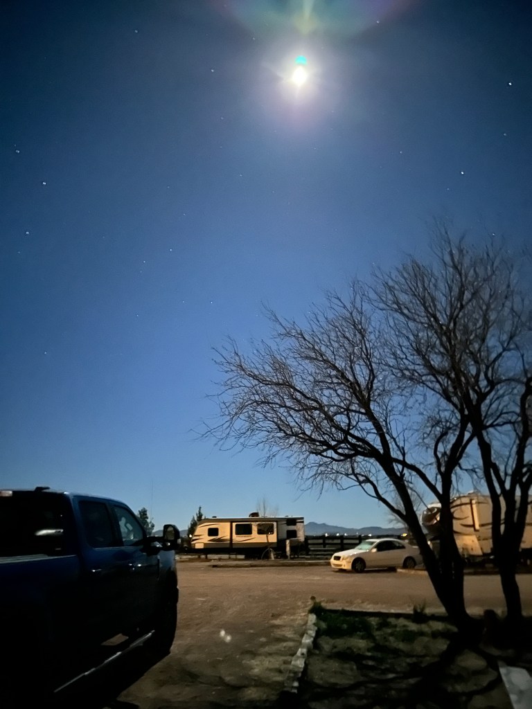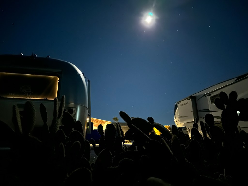 Our stop that night was at a Harvest Host site called the Cattle Rest Bar in Wilcox, Arizona. The site was great, although our host in the bar – “Ms. Personality” – was memorable for other reasons.
