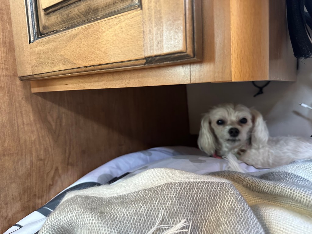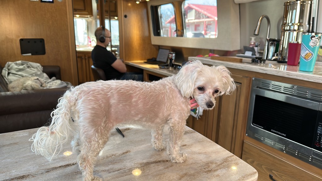 Bella has taken to standing on the dinette table to supervise the day’s activities.