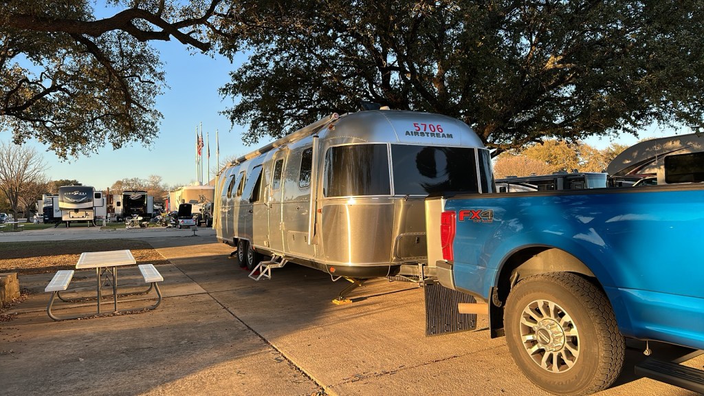 Tomorrow, we’ll wake up early and do it again. Fortunately, we’re almost done with these one-day hops. Tomorrow we’ll head to Houston for our last one-night stand, then Saturday we’ll head to New Orleans for three nights, then to the Florida panhandle for two nights, then to central Florida for three nights. We’re looking forward to this mild relaxation in the travel schedule.