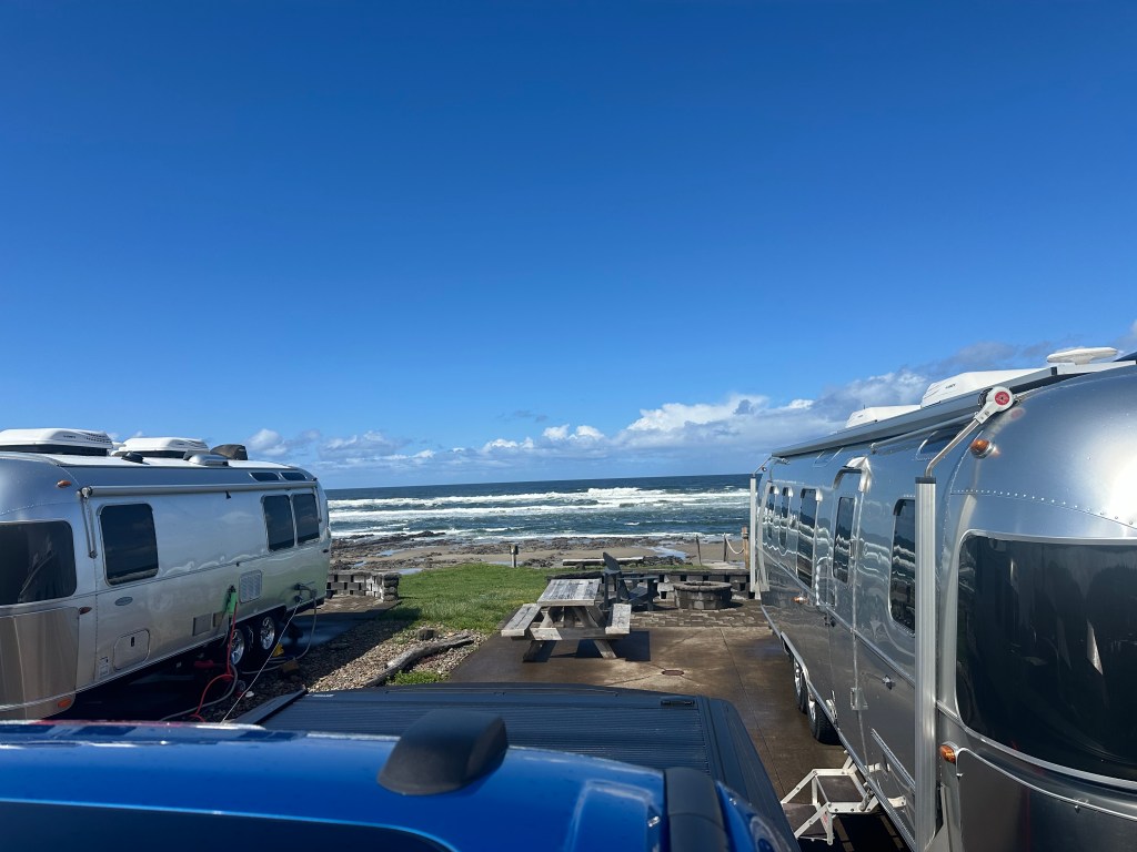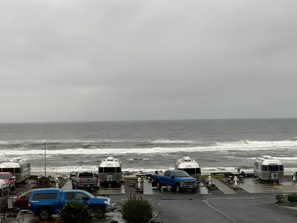 We have signed up for six cult rallies for 2024, so brace yourselves for pictures of Airstreams gathered in flocks. Our first cult rally was spent backed up directly to the Pacific Ocean. That’s us in the middle.