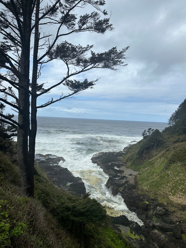 While in the vicinity, we visited Yachats for lunch and some grocery shopping, and on the way back we visited “Devils Churn,” a nearby wayside where the waves have cut deep into the cliffs, leaving an opportunity to see waves crashing up close but still safely above any danger.