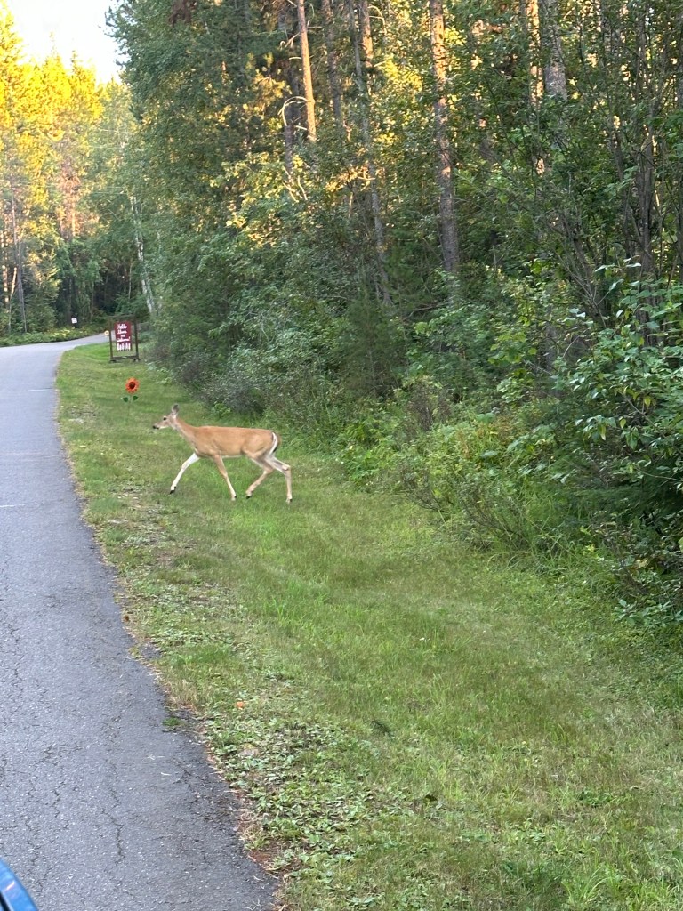 But we’ve seen nothing except a few cattle in the fields outside the park, a fiew small forest rodents, and a couple of dogs running free from homes along the road. Only this evening did we finally see one deer, but rather than in the park, this deer was in the entryway to our campground.