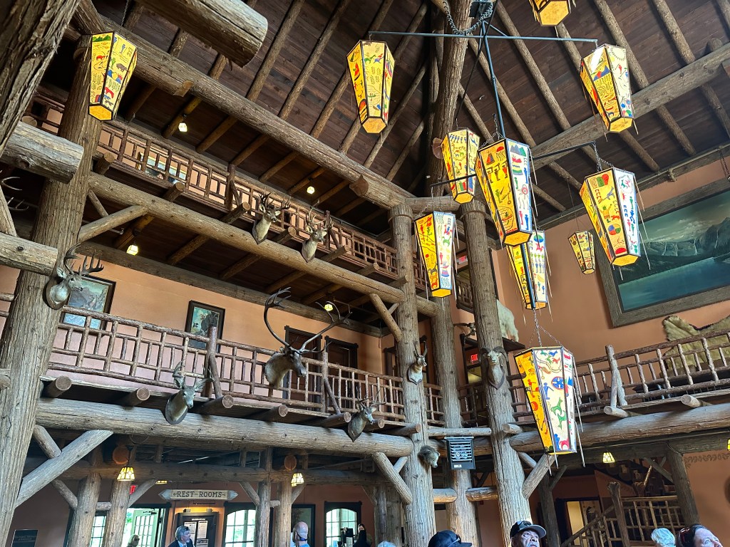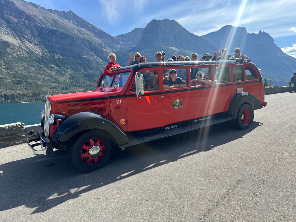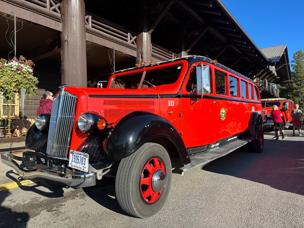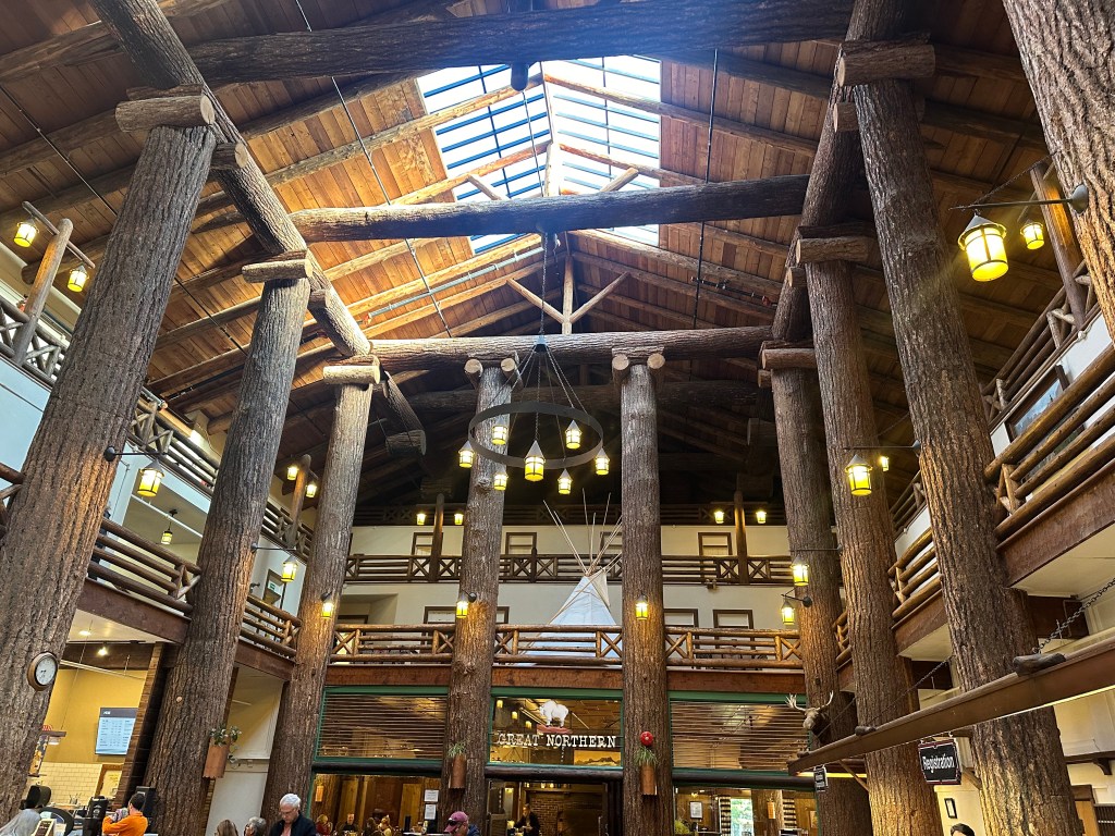Day 2 was the bus tour, which departed from Glacier Park Lodge in the village of East Glacier. Our campground is just outside West Glacier, meaning we had an hour drive in the morning around the outside of the southern border of the park to get to the muster point. However, the Glacier Park Lodge is also very beautiful, similar to the Many Glacier Lodge but with a more traditional log-cabin architecture rather than the Swiss-Chalet style.