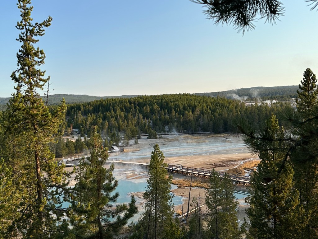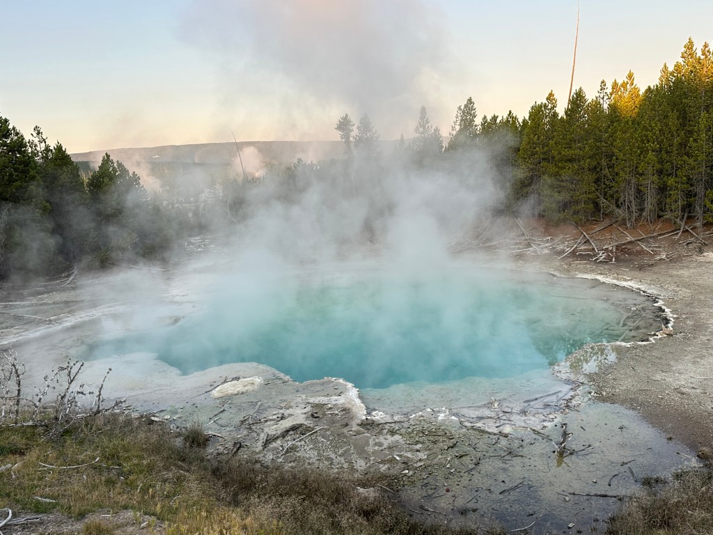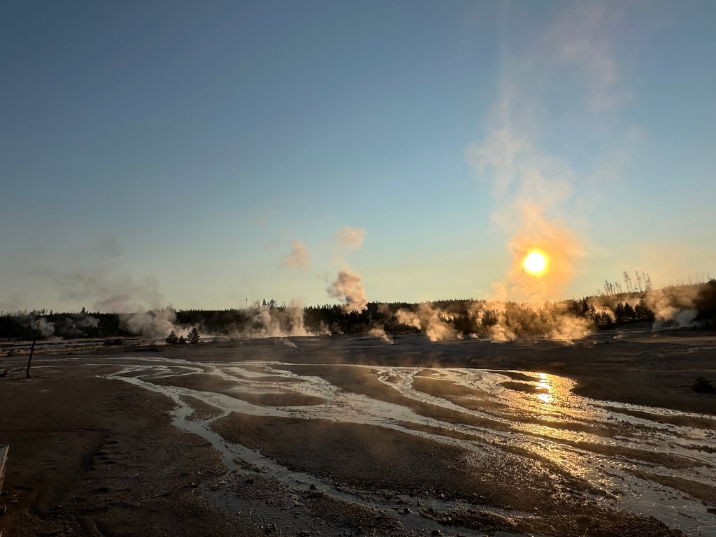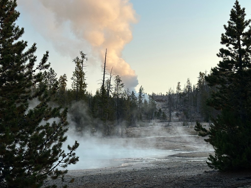 We skipped Old Faithful due to time constraints, but the Norris Geyser Basin is another geothermal area that offers a more engaging and surreal experience. We visited early in the morning with very few others present, and the steam rising against the cold sunrise air created a unique serenity.