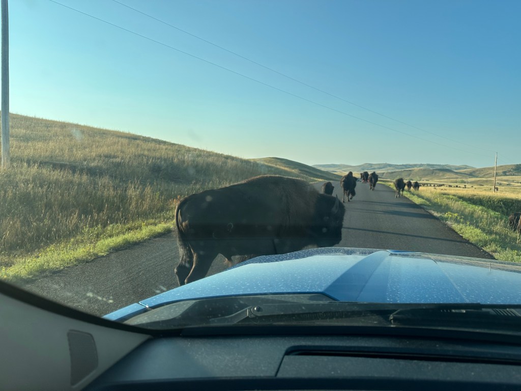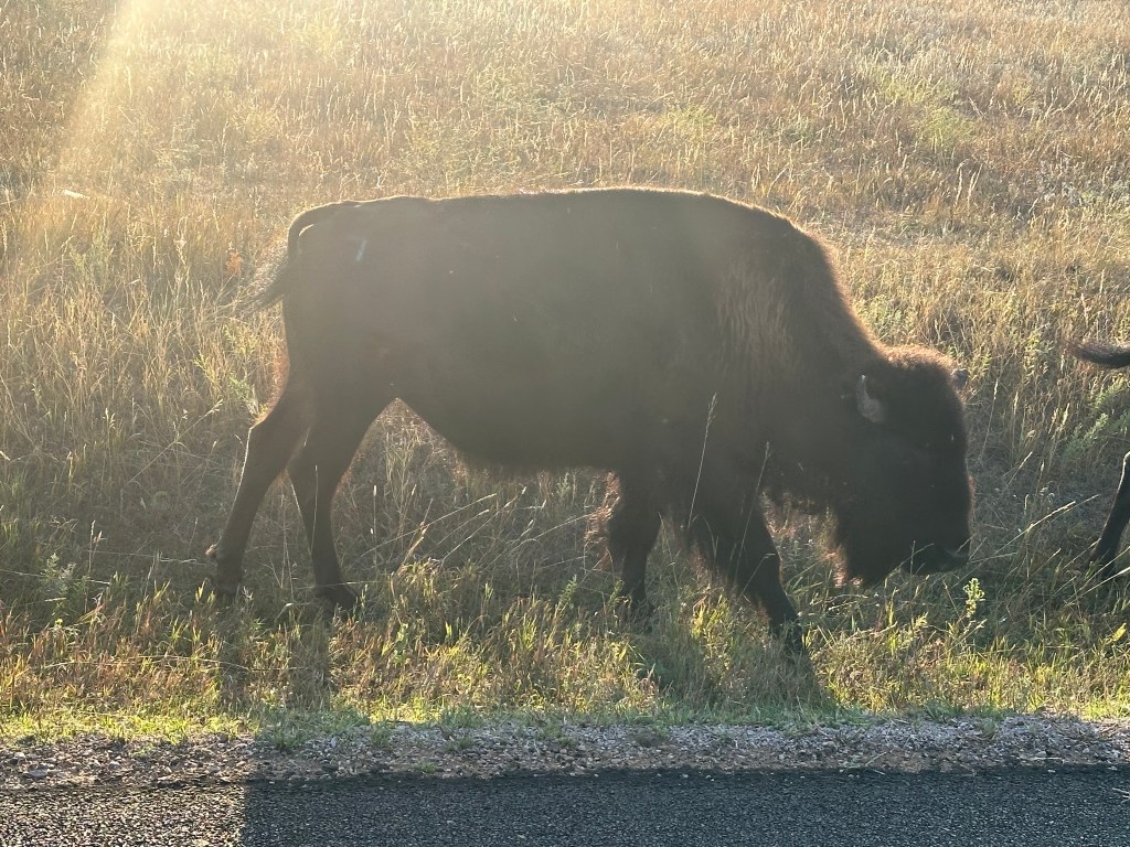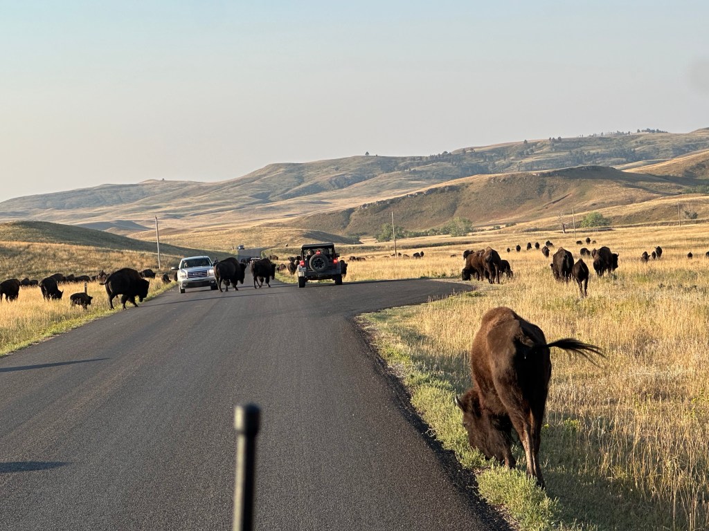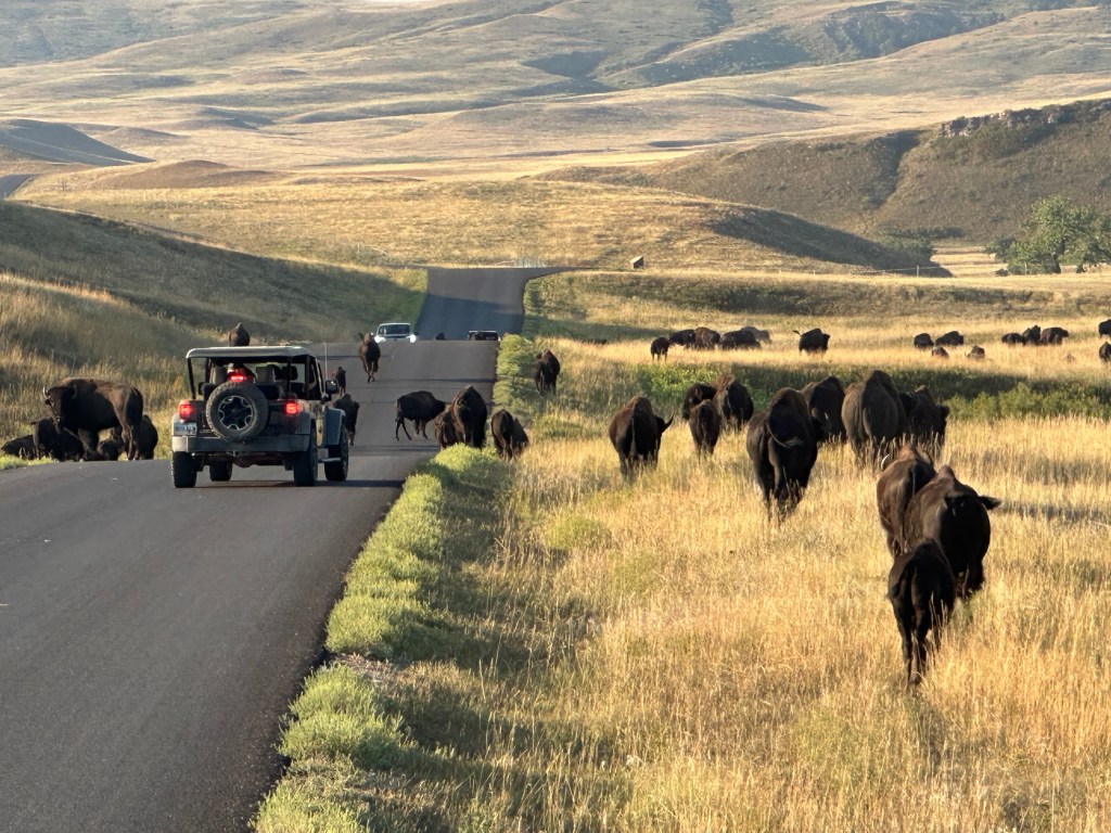 Perhaps most interesting at Custer were the bison. On our visit to Yellowstone – where bison are usually ubiquitous – the bison were at some distance this time. However, whatever bison cravings might have remained were satisfied at Custer, because the herd was out in force and occupying the road.