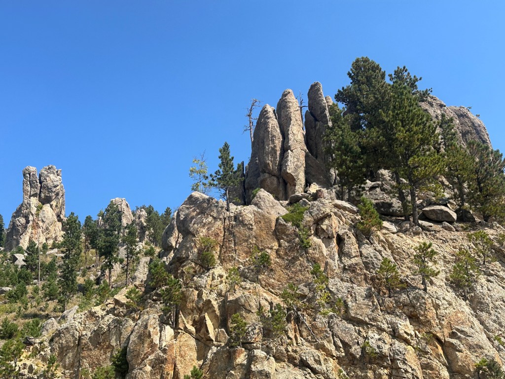 The overall impact, the history, and the presentation itself were all fascinating, starting with the surrounding highway drives. The Needles Highway is a scenic narrow drive toward and through a series of tall rocky spires, which are beautiful in their way, and are popular with rock climbers for obvious reasons.